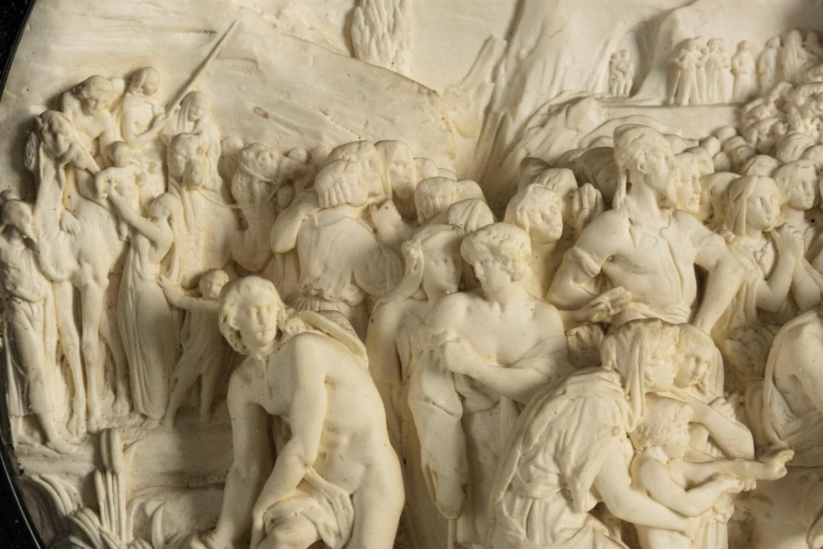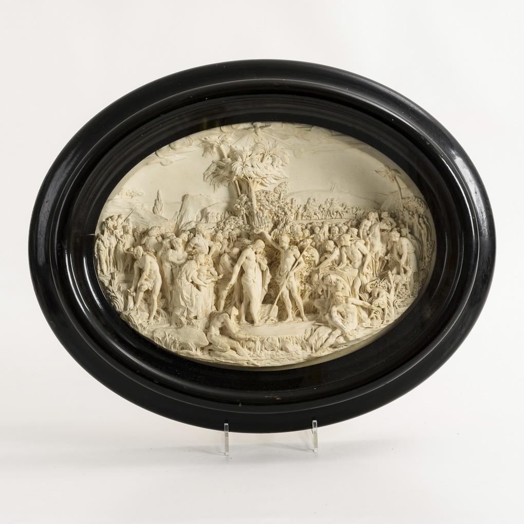 Hochrelief mit der außerordentlich figurenreichen Darstellung. 1 Arm geklebt, Trockenriss und minimale Lackschäden am Rahmen.