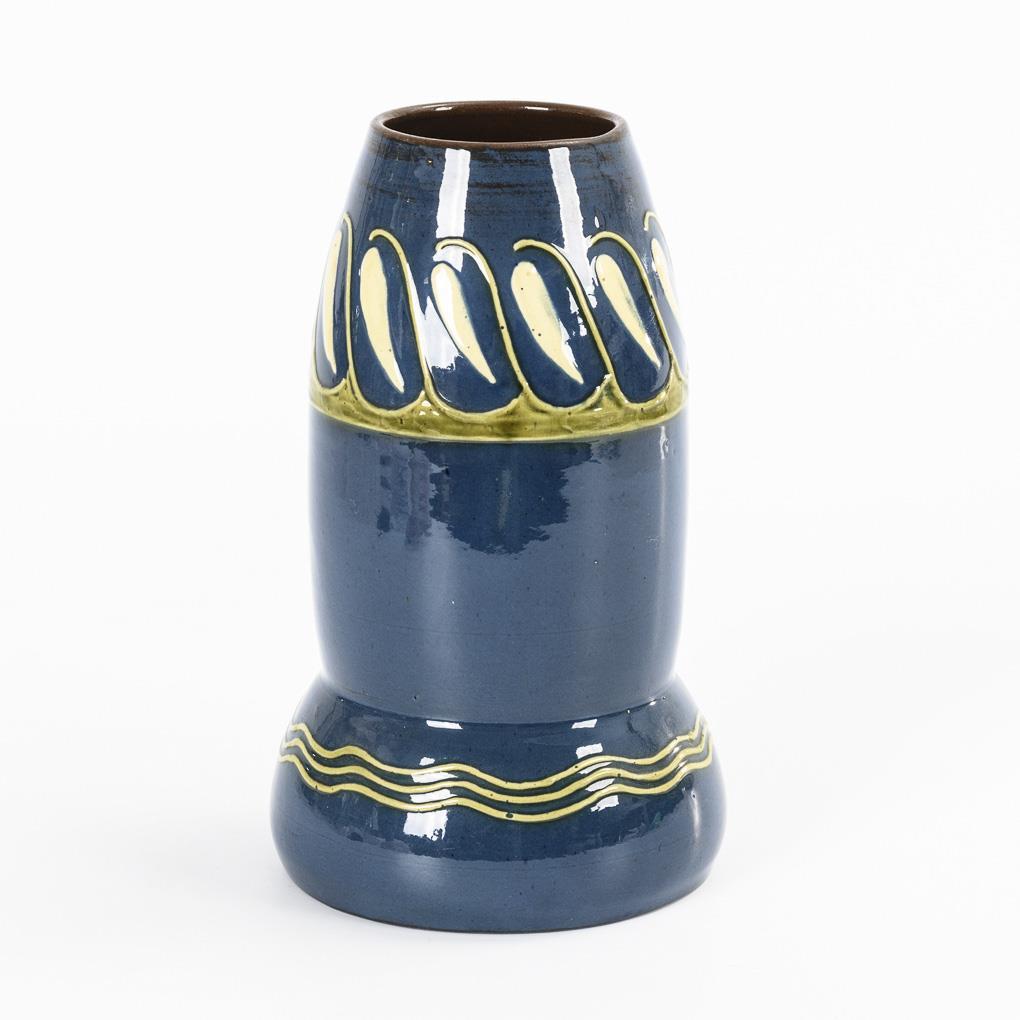 Steingut, blau und braun glasiert, grüne und weiße Schlickerbemalung mit Wellenendekor. H 24 cm.