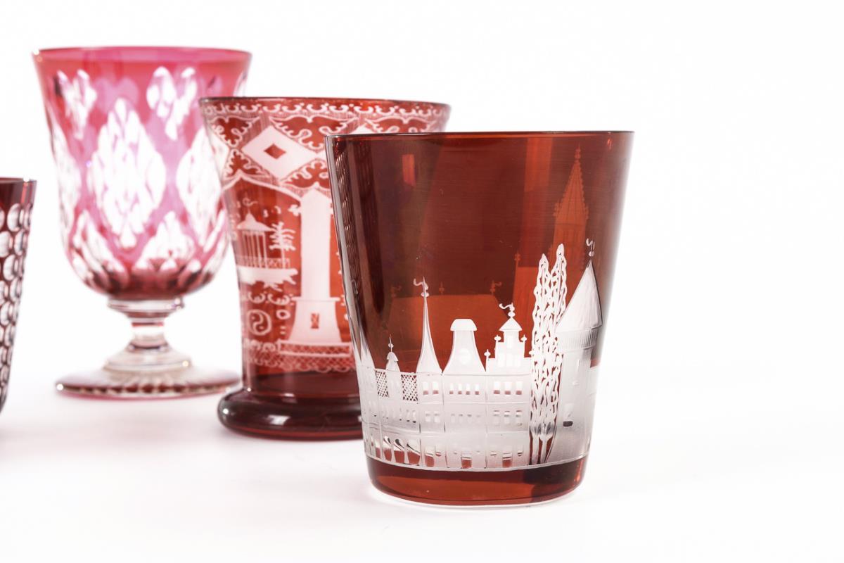 2 konische Becher mit Linsenschliff. /1 konischer Becher mit gravierter, teils geblänkter Stadtansicht. / 1 Kraterbecher mit gravierten Ornamenten und Architektur. / 1 Fußbecher mit Schliffdekor und Bodenstern.