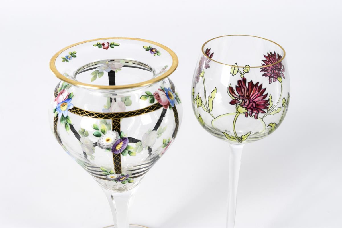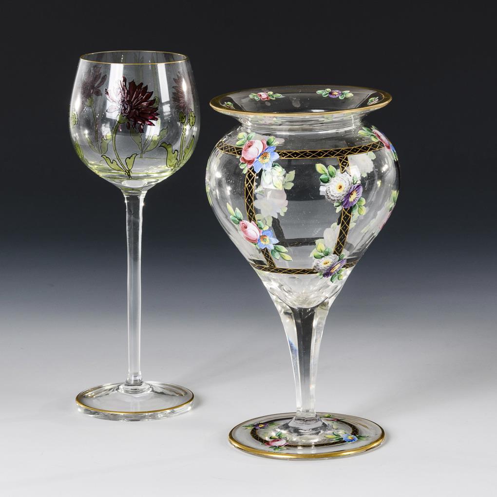 Farbloses Glas, polychrome Emailmalerei, Goldstaffage. H 17,5 und 19 cm.