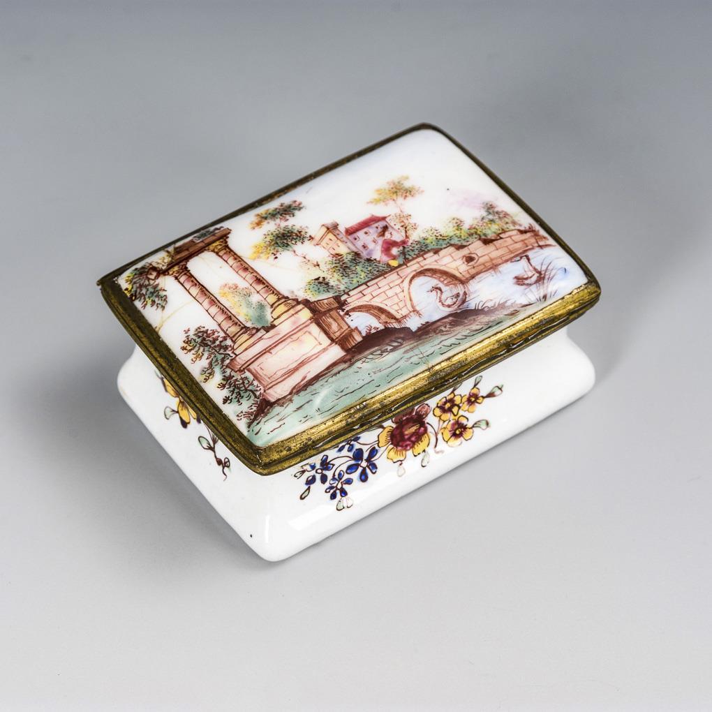 Kupferemail mit Emailmalerei, Messingmontierung. 3 x 6 x 4,5 cm.