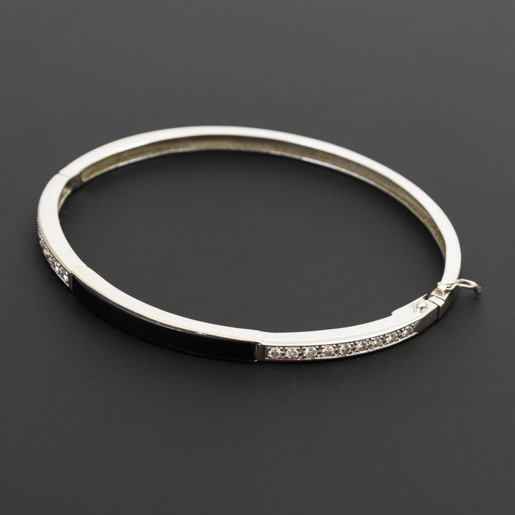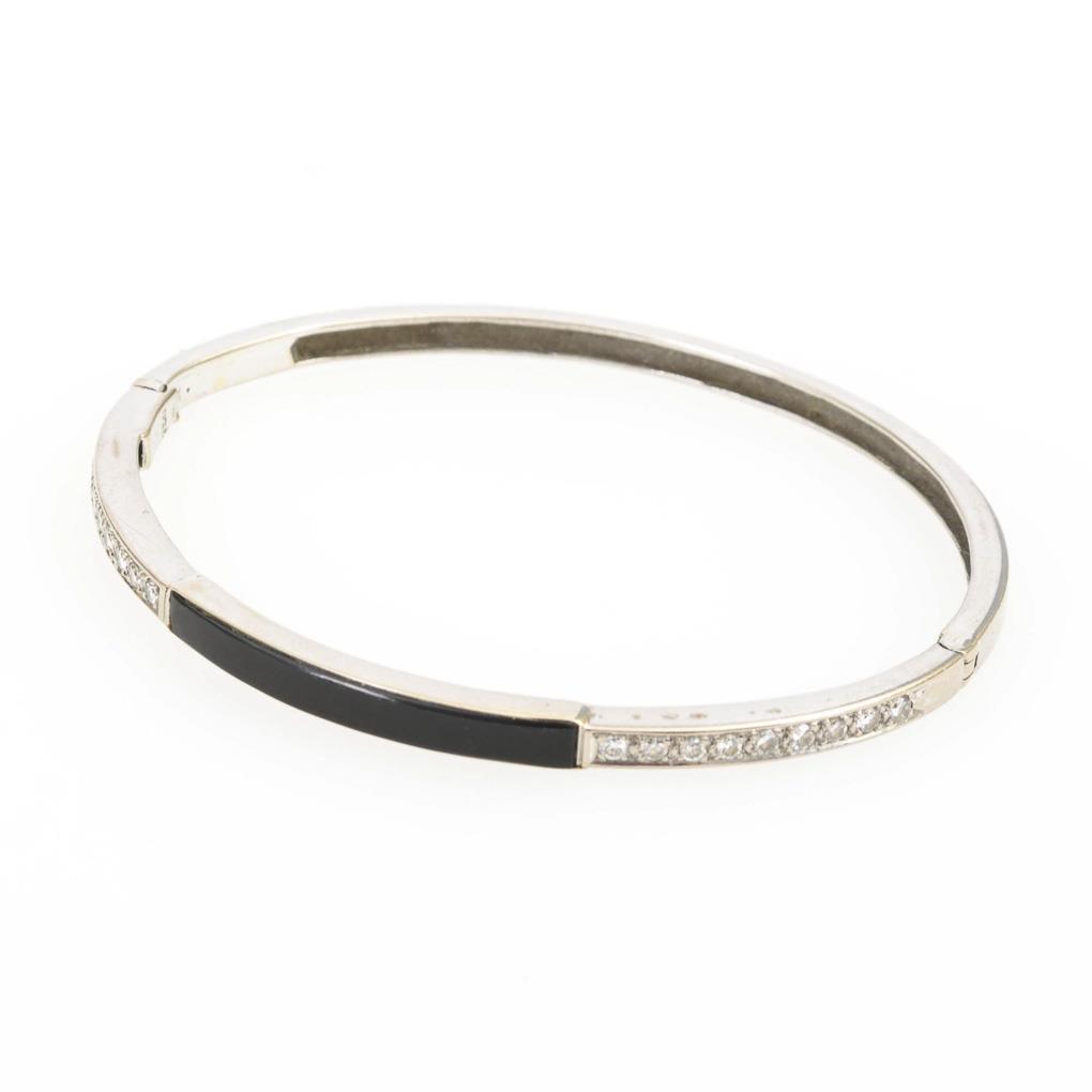 Ovaler Klappreif mit Onyxeinlage und 18 eingelassenen Brillanten. Kastenschloss mit Achtersicherung.