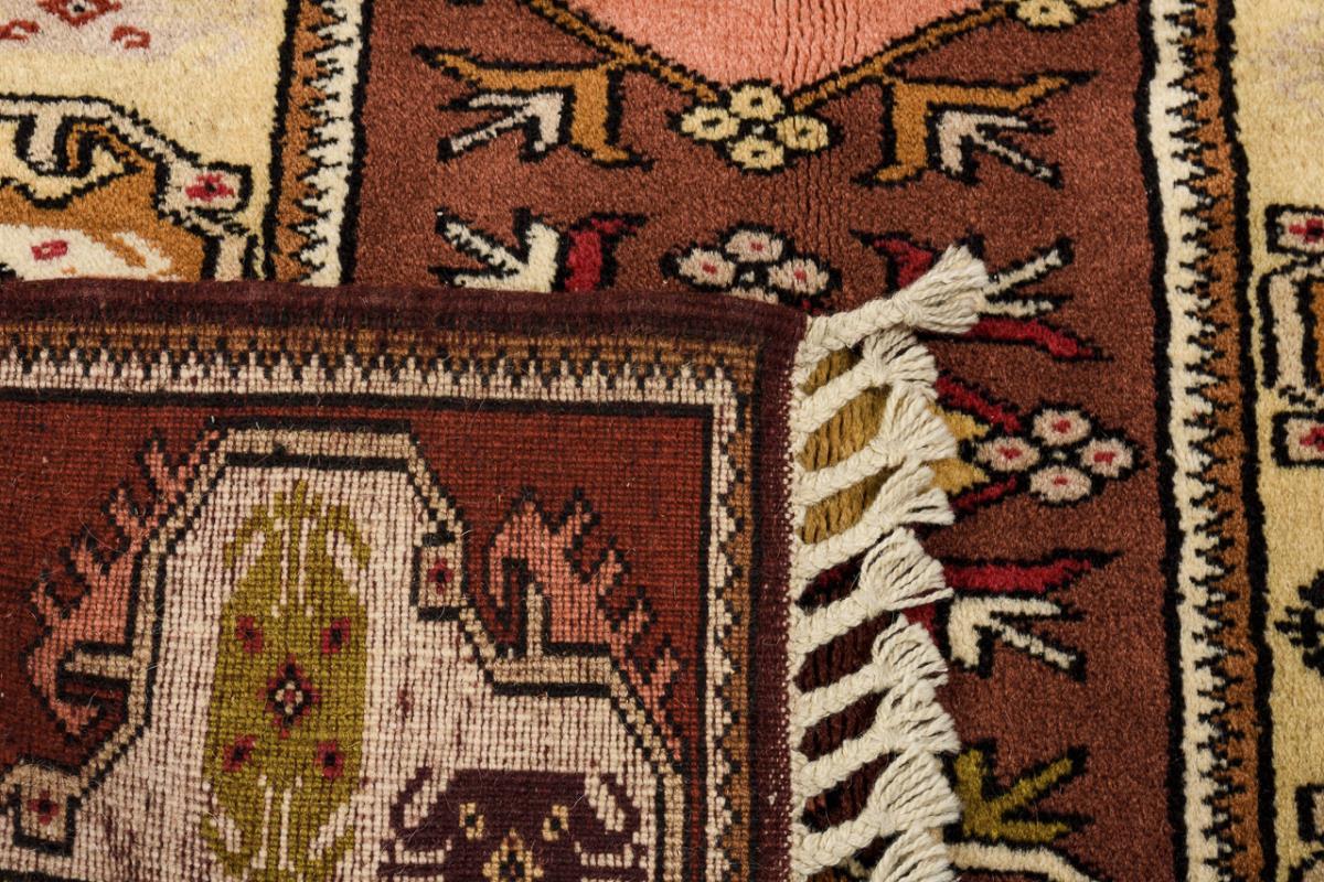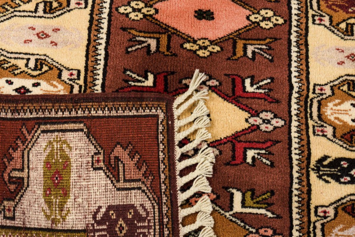 Schmales Mittelfeld mit einer Reihe großer, stilisierter Blüten. Zwei breite Bordürenstreifen mit gezahnten Wellenranken und Samowar-Motiven. Kelim- und Flechtabschlüsse. Minimalste Gebrauchsspuren.