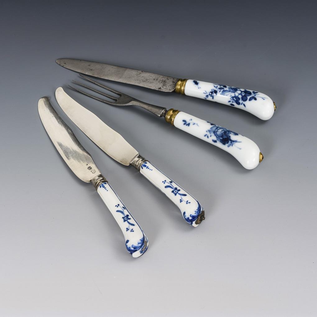 2 Messer mit indianischer Blumenmalerei sowie 1 Gabel und 1 Messer mit Blumen- und Insektenmalerei.