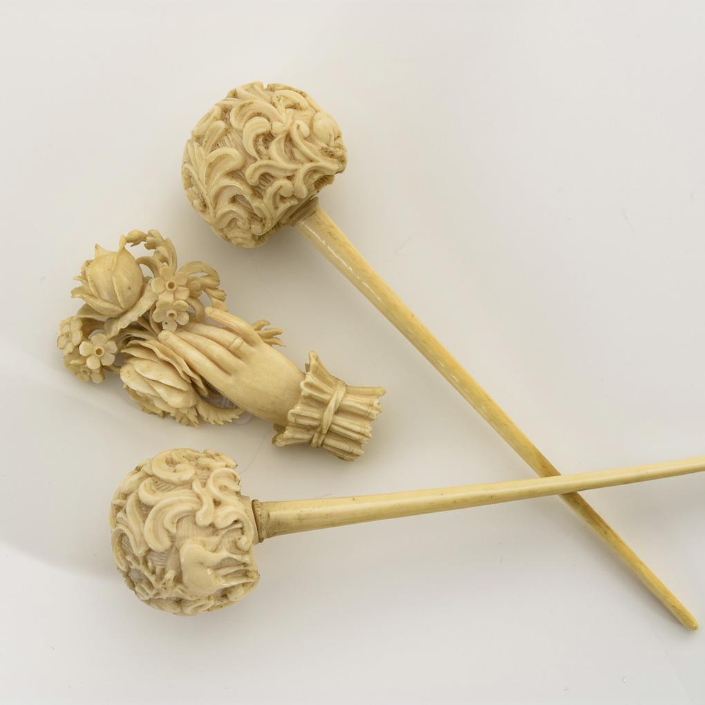 Elfenbein-Brosche und Paar Haarnadeln aus Bein. Erbach?.