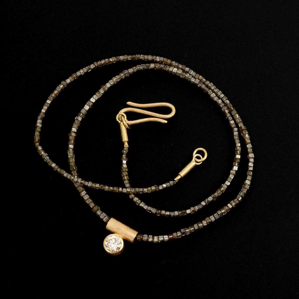 An Schnürkette mit kleinen Rohdiamantstücken ein zargengefasster Brillant. Hakenverschluss.