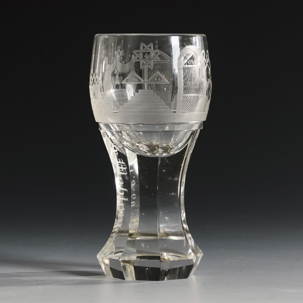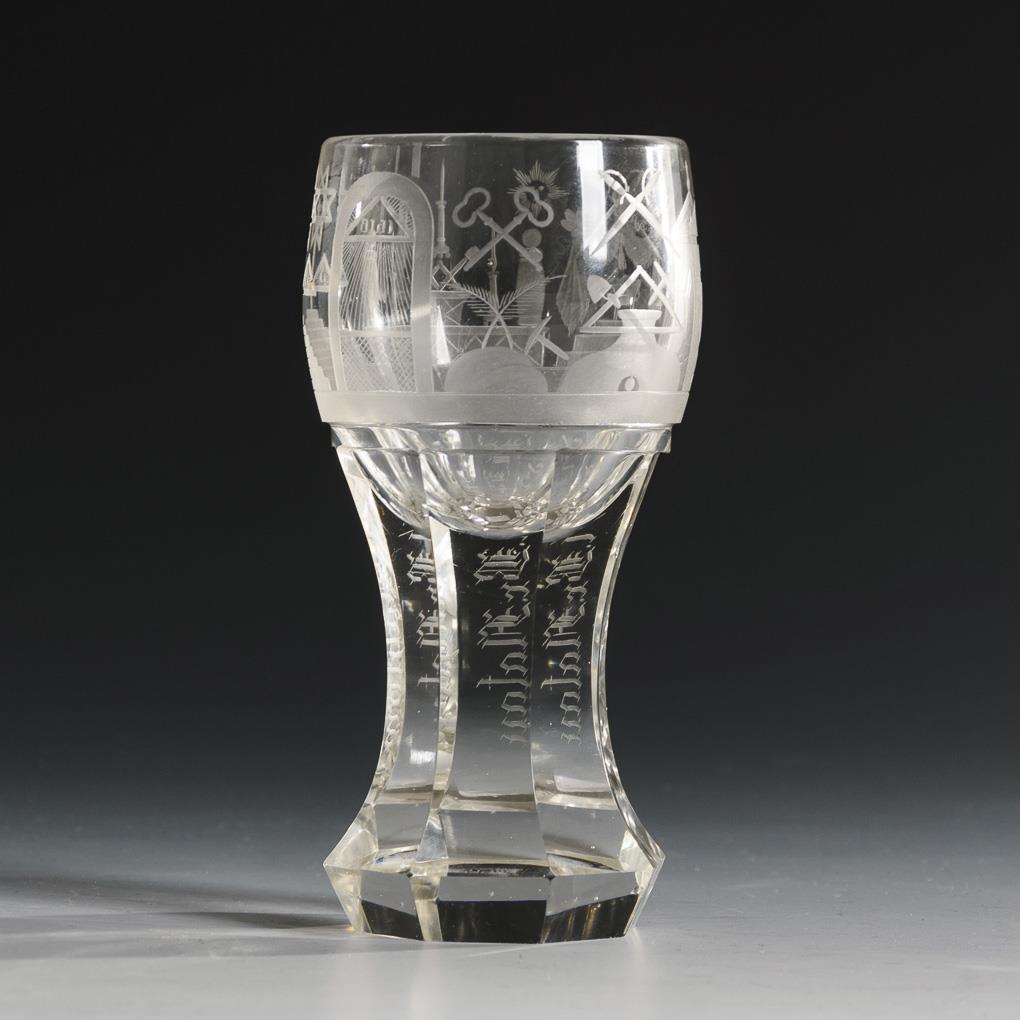 Sogenannte Römerkanone. Glockenkuppa, facettierter, massiver Schaft, ausgekugelter Abriss. Graviert mit verschiedenen Freimaurersymbolen sowie der Widmung "Br. Mahlow s/l. Br. Flatau d. 4.5.80". Minimale Bestoßung an 1 Schliffkante.