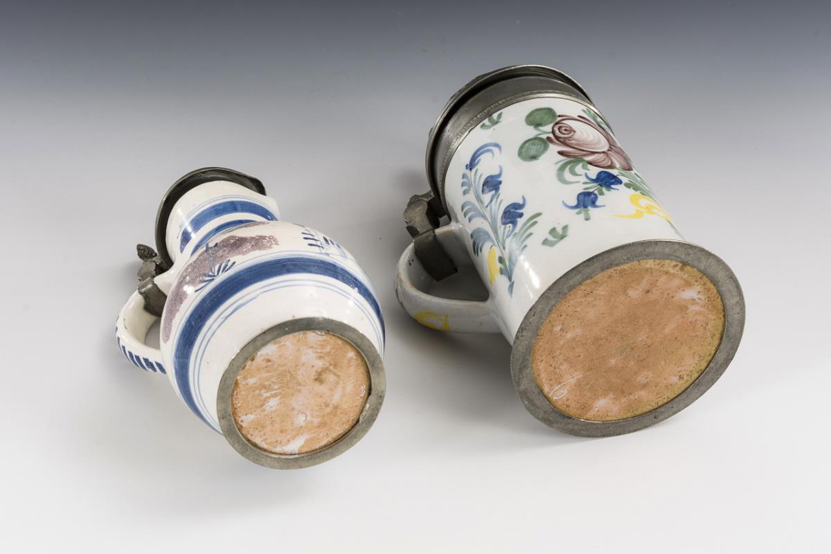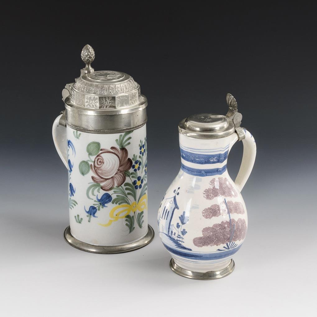 Walzenkrug mit Blumenstrauß, am Boden geritzte "9", ergänzter Relief-Zinndeckel, Zinnstand (H 25 cm). Kleiner Birnkrug mit Architektur, ungemarkt, Zinndeckel mit Muscheldrücker, graviert "PW" (H 21,5 cm). Walzenkrug mit 2 Haarrissen und gelockerter Zinnmontierung, partiell leichte Glasurdefekte.