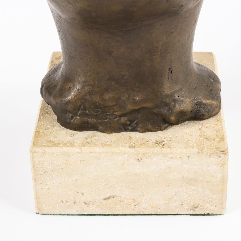 Bronze patiniert, Kalkstein-Sockel. Bezeichnet mit Datum (19)"55", Gießermarke "Strassacker Kunstguss Süssen". H 24 / 29 cm.