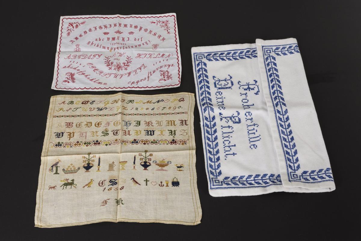 ABC-Stickmustertuch mit volkstümlichen Motiven, datiert 1838, Monogrammen CSI und FK. ABC-Stickmustertuch mit floralen Dekoren und Kronen, datiert 1882, Monogramme EI, AW, VS. Aus Arbeitsstoff genähte Tasche mit ABC-Stickerei, Randdekoren und Sprüchen , datiert 1914, signiert K. Veit. Farbigkeit gut erhalten, verteilt Liegespuren.