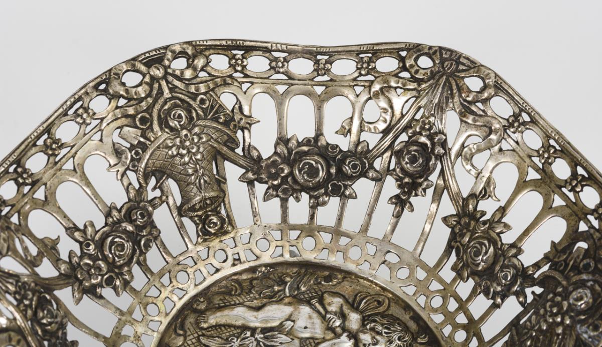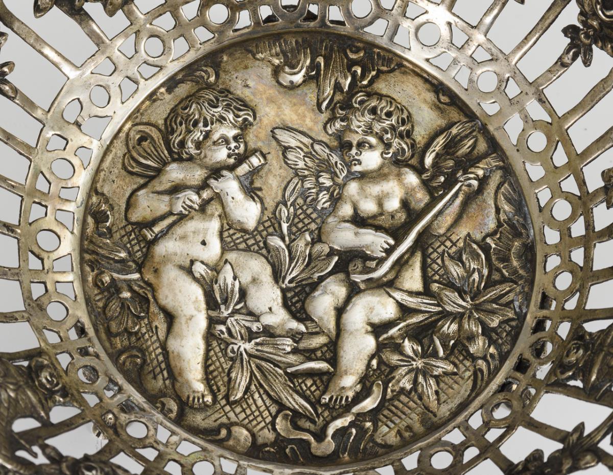 Rundes Körbchen mit musizierenden Putten und Rosengirlanden. Wenige kleine Lötstellen, 1 Fuß etwas gestaucht.