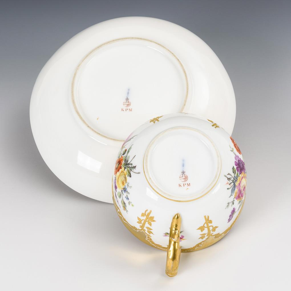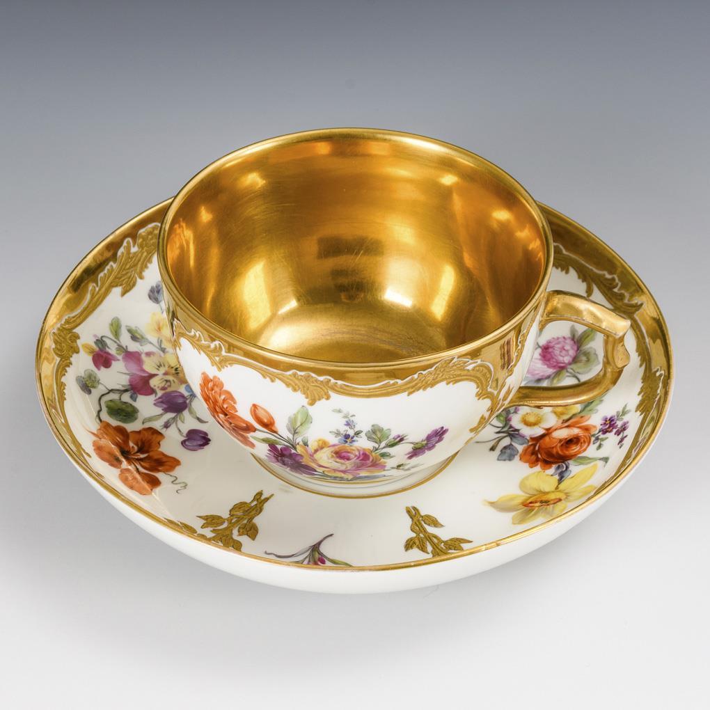 Polychrom bemalt, goldstaffiert, teils goldbronziert. H Tasse 6,5 cm, Ø originale Untertasse 18 cm.