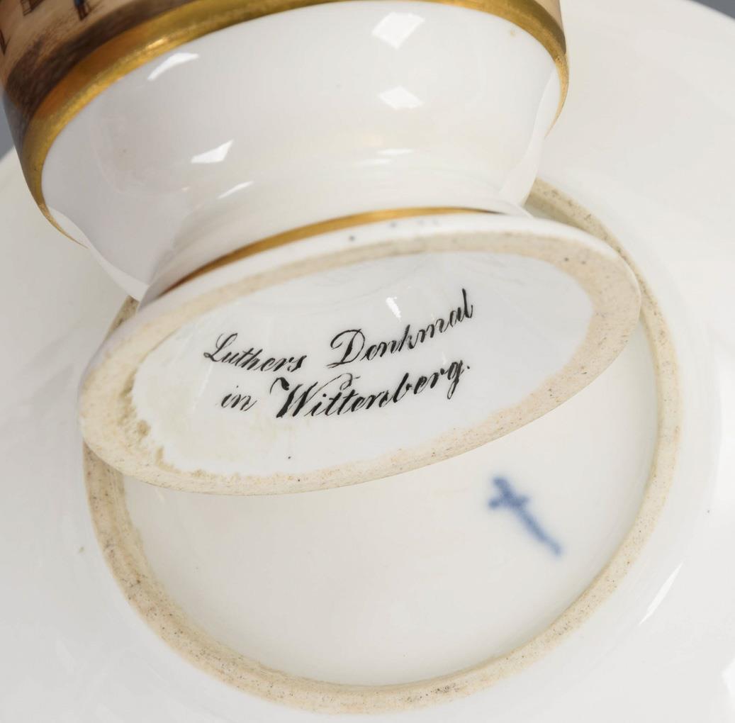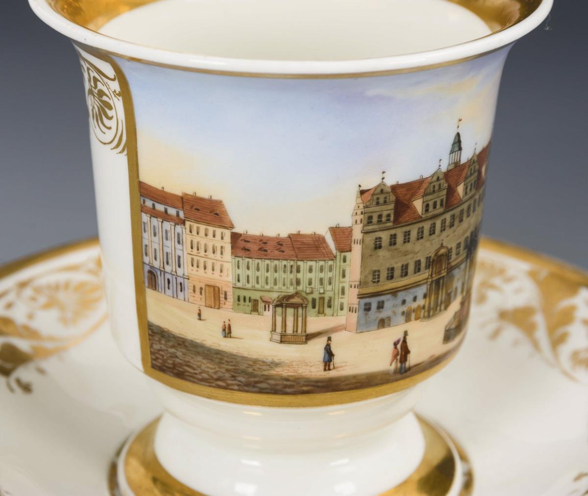 Gefußte Kratertasse mit Greifenkopfhenkel. Schauseitig eine goldgerahmte Rechteckkartusche mit der unterseitig bezeichneten Ansicht des Marktplatzes mit Lutherdenkmal in Wittenberg. Minimaler Goldabrieb an der Untertasse.