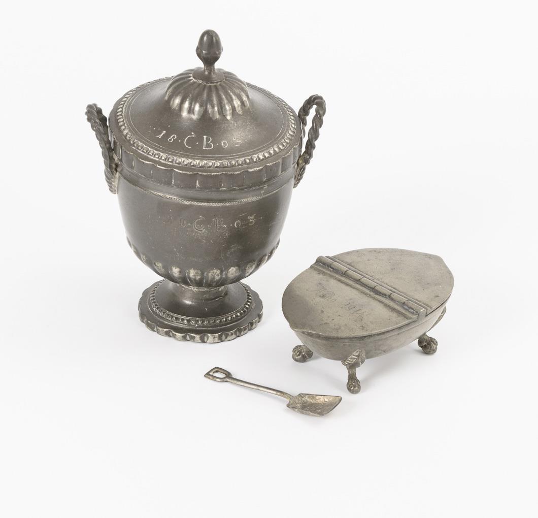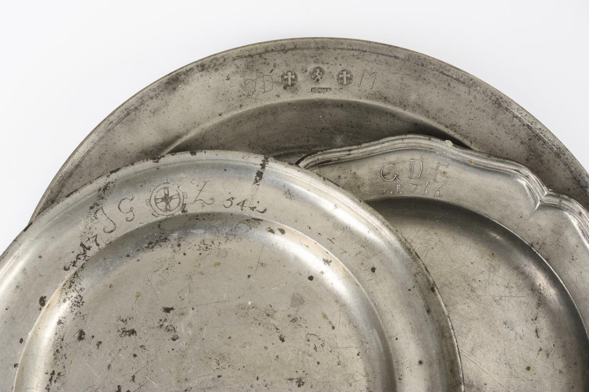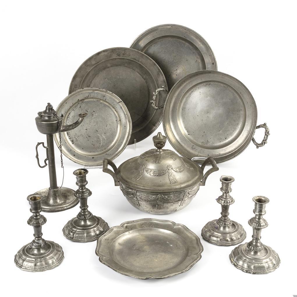 Terrine mit Girlanden, Schüssel mit Delfingriffen, 2 Platten, 2 Teller, Ölfunzel, Empire-Dose, 4 Kerzenleuchter in barocker Silberart, Weihrauchschiffchen mit Spatel. Teils Gravuren mit Daten des 18./19. und frühen 20. Jh. Alters-/Gebrauchsspuren.