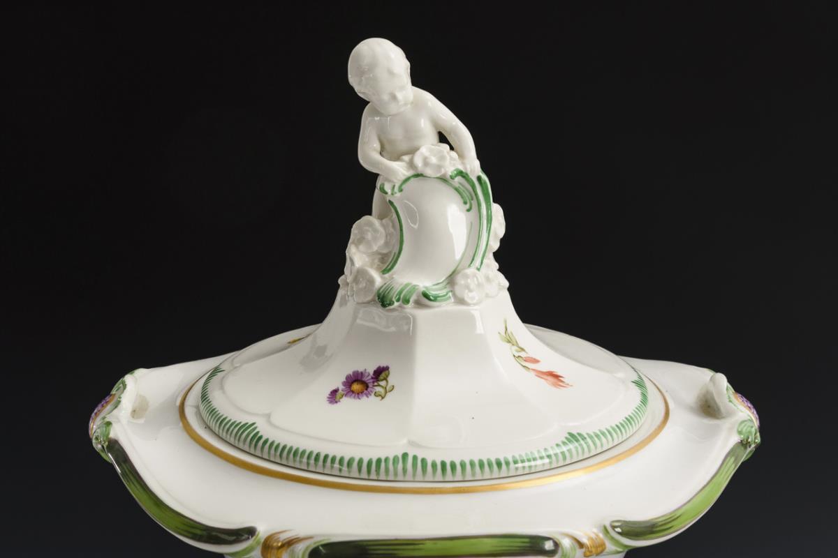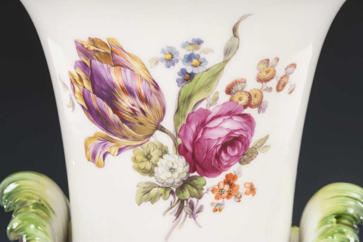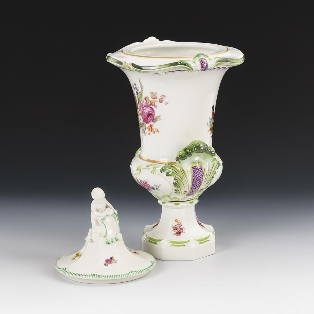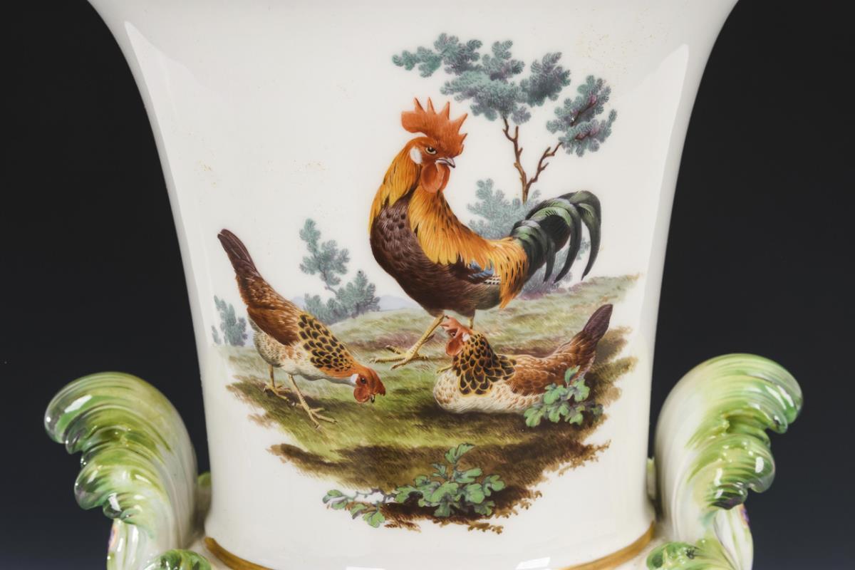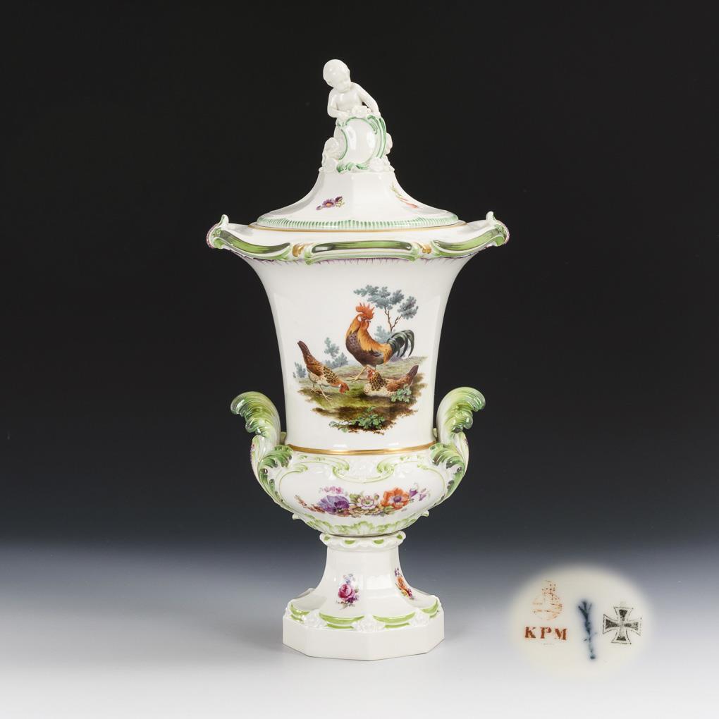 Kratervase mit Blatthandhaben, polygonalem Fuß und passend ergänztem Deckel sowie einem Putto mit Schild als Deckelknauf. Schauseitig die Darstellung einer Landschaftsinsel mit Hahn und zwei Hennen, verso ein Blumenbukett.