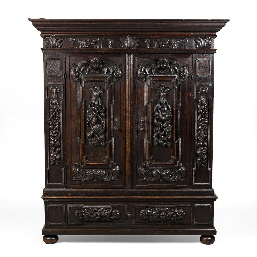Aufwendig gestalteter 2-türiger Fassadenschrank mit Sockelschub und getrepptem Gesims, auf geplätteten Kugelfüßen; üppig verziert mit plastischem Schnitzwerk aus Puttenköpfen, Maskaronen und Akanthusblattmotiven. Wohnfertig restauriert, Alters-/Gebrauchsspuren, fehlende Zierleisten.