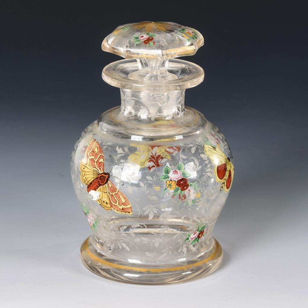 Gedrückte Balusterform, facettierter Stopfen, ausgekugelter Abriss. Auf der Wandung gemalte Schmetterlinge und kleine Blumenbuketts sowie weiße Blattranken. Etwas berieben, kleine Bestoßung am Mündungsrand.