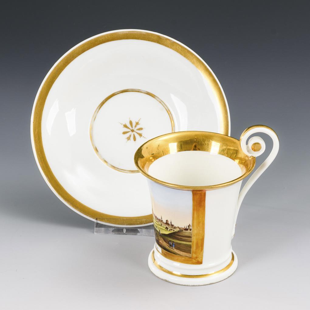 Polychrom bemalt, goldstaffiert. H Tasse 10 cm, Ø ergänzte Untertasse 13,5 cm.