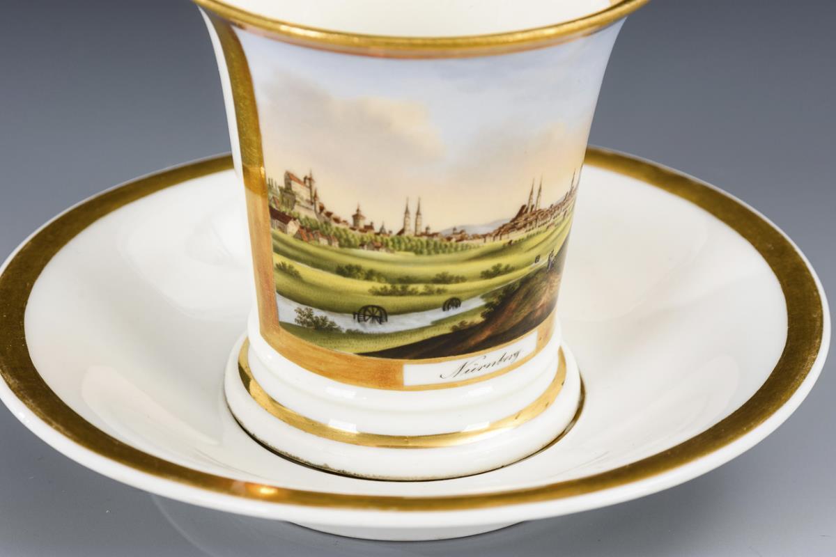 Kratertasse mit Rosettenhenkel. Schauseitig eine goldgerahmte Rechteckkartusche mit der bezeichneten Vedute der Stadt Nürnberg.