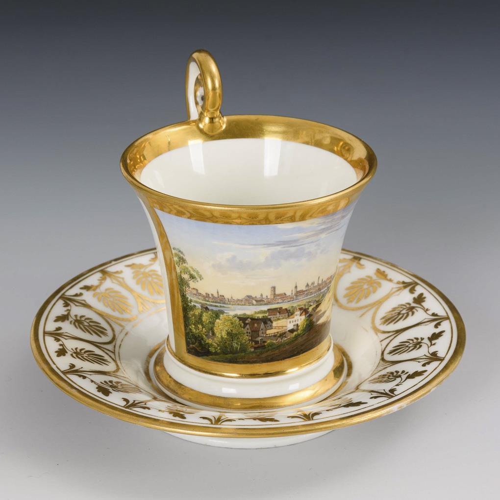 Kratertasse mit Maskaronhenkel. Schauseitig eine goldgerahmte Rechteckkartusche mit der unterseitig bezeichneten Ansicht der Stadt München. Untertassengold etwas berieben.