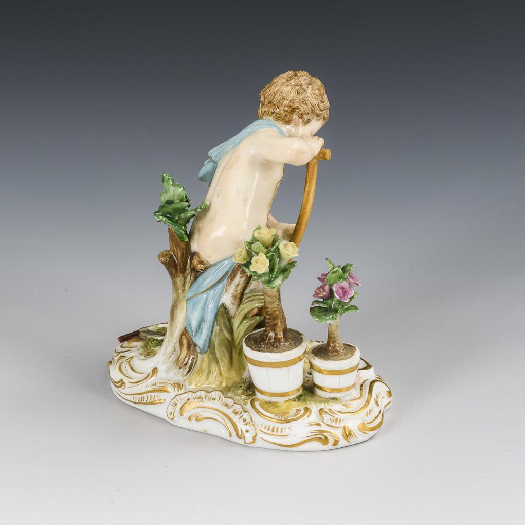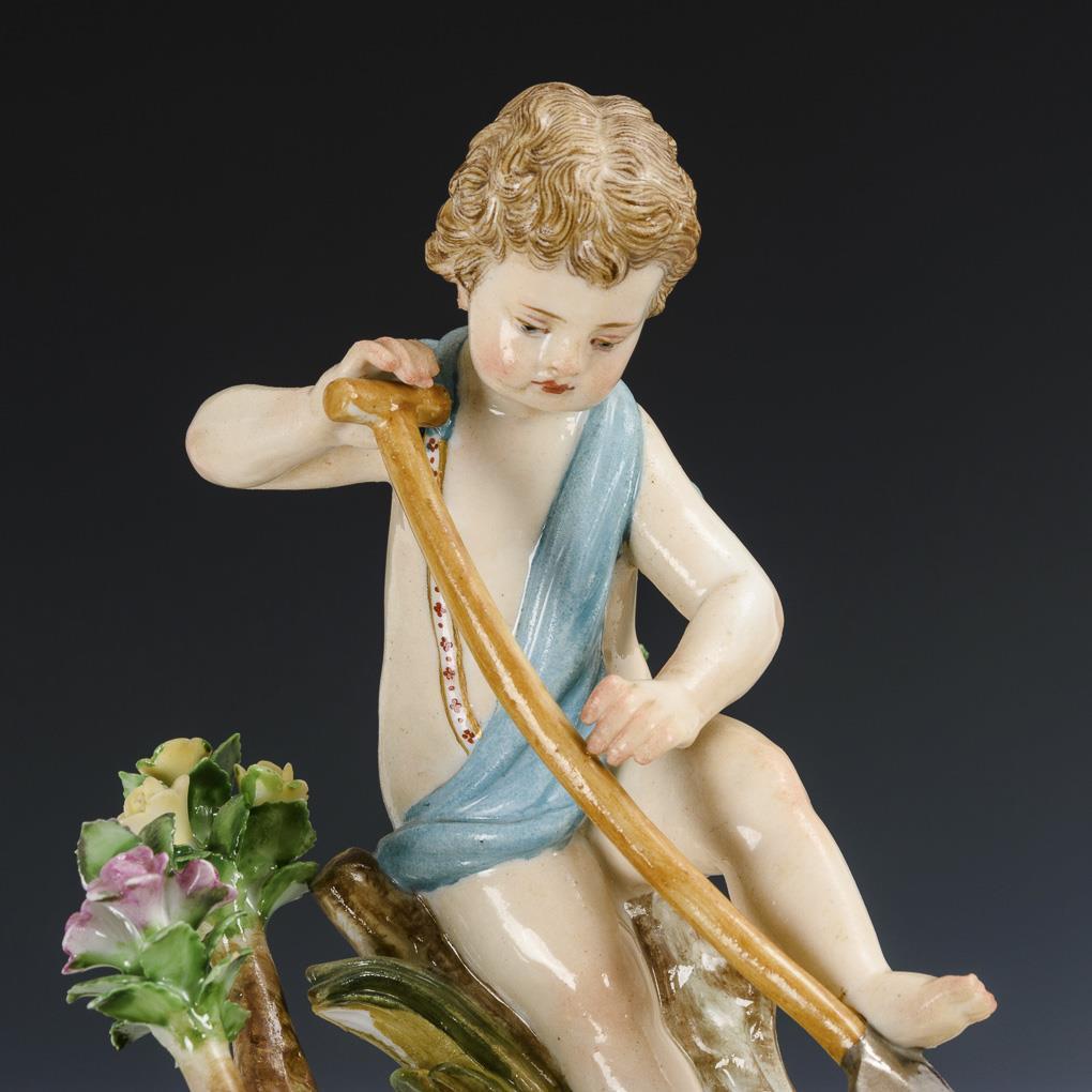 Vor zwei Rosenstöcken stehender, den Garten umgrabender Putto. Sichel, Rosenstämme und 1 Ast restauriert.