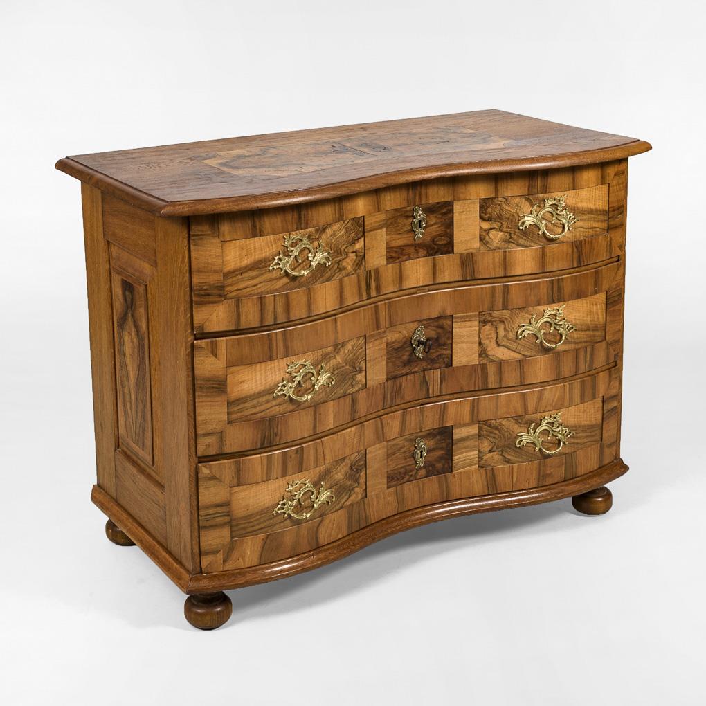 3-schübiger, stiltypisch geschwungener Korpus, verziert mit Maserfurnier und Kassettenfüllungen; Schübe mit Rocaillengriffen und bronzierten Schlüsselbeschlägen. Wohnfertig restauriert, Griffe passend ergänzt.