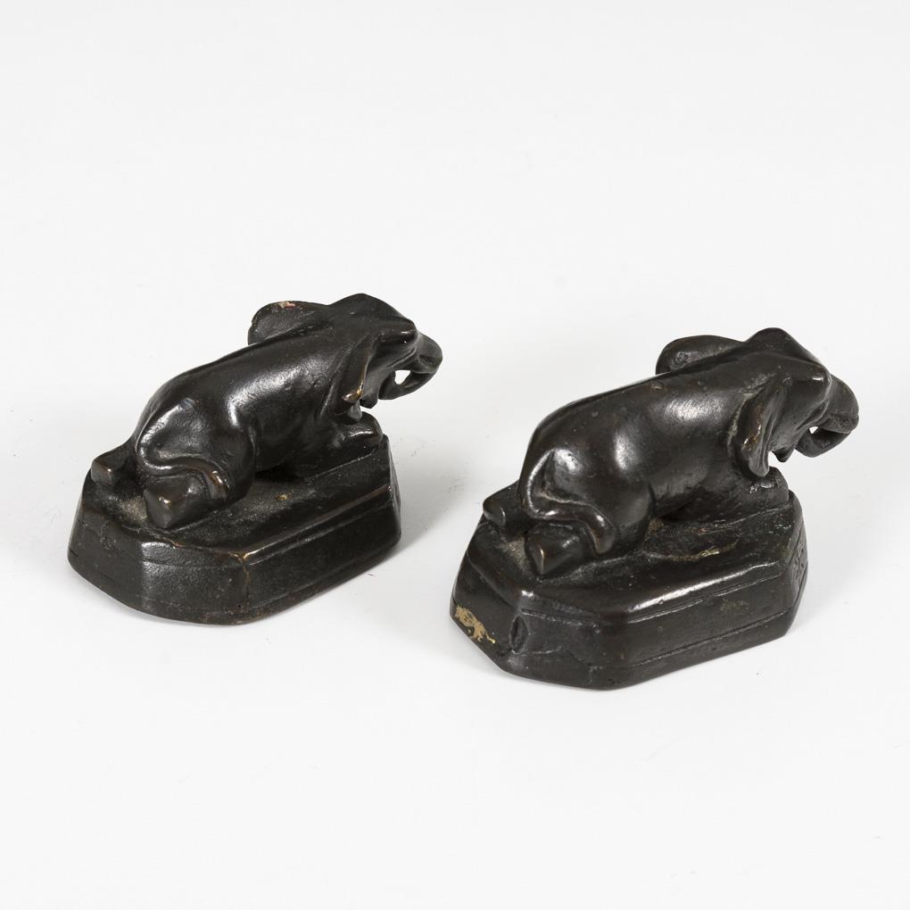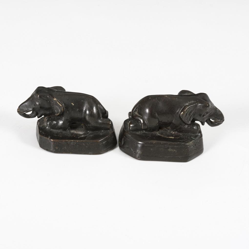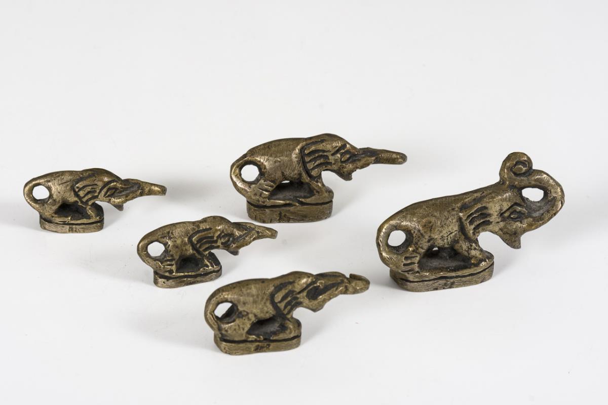 5 Elefanten in abnehmender Größe mit Rüssel und Schwanz als Haken und Öse. 2 liegende Elefanten auf achteckigen Sockeln.