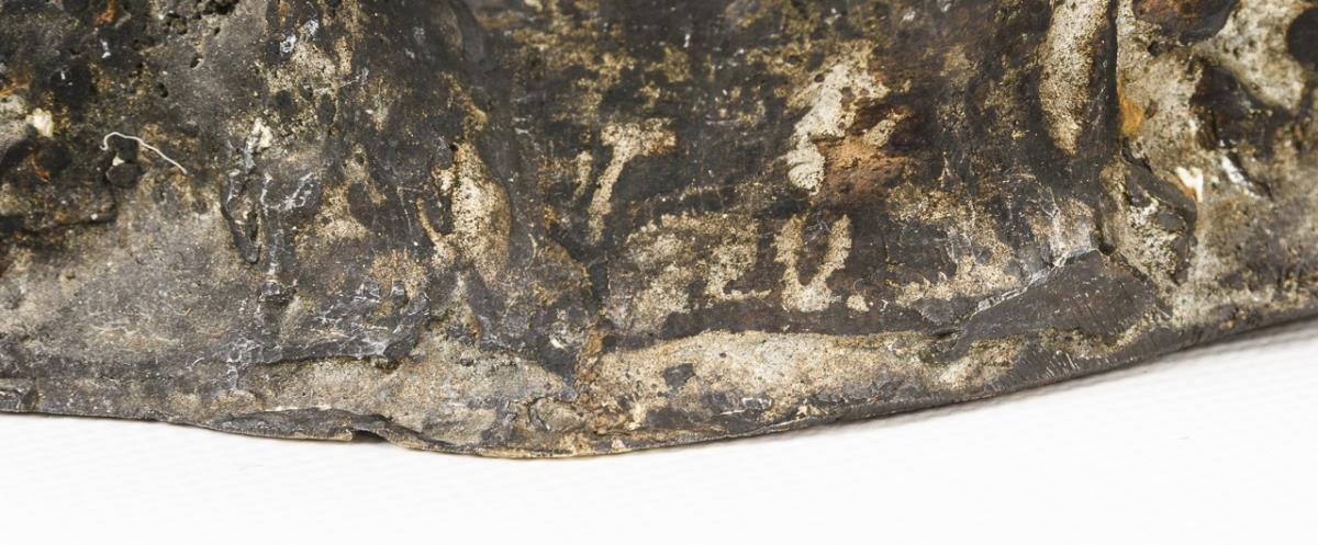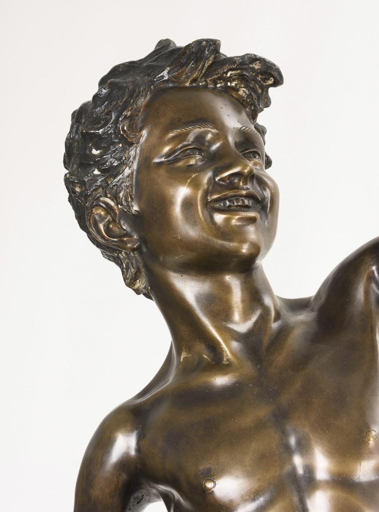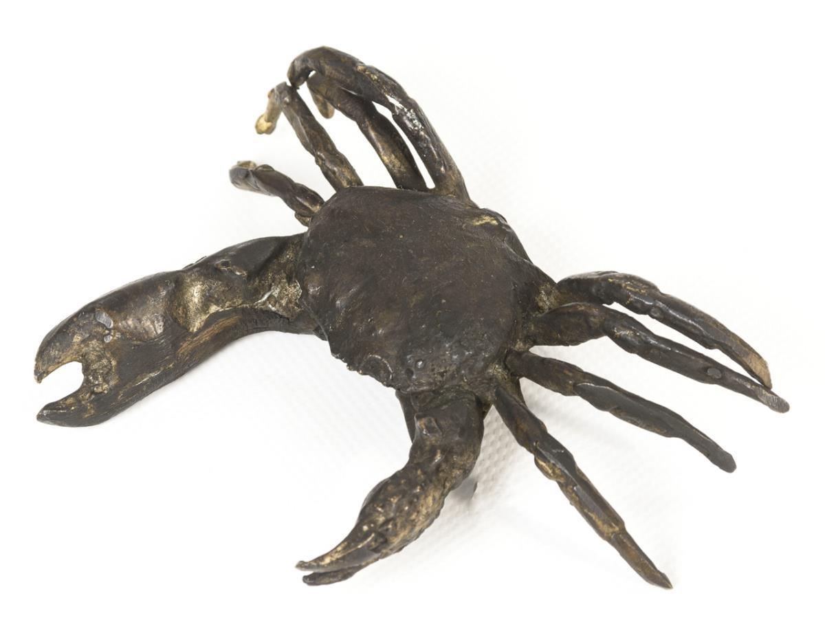 Stehender Knabe im Lendenschurz, der die Krabbe hochhält. Teils sichtbare Gussnähte, einige Schrammen.