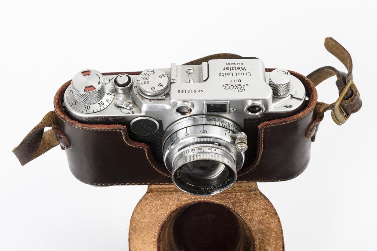 Leica-Fotoapparat im Lederetui und mit Zusatzobjektiv.