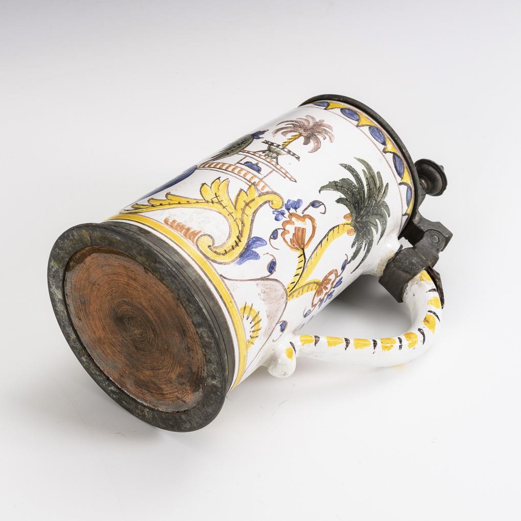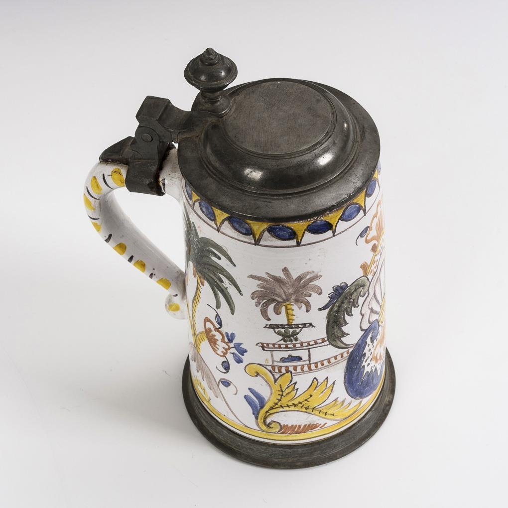 Leicht konischer Zylinderkrug mit endvolutiertem Bandhenkel. Muschel- und Rocaillemalerei mit flankierenden Palmen. Gewölbter Zinndeckel mit Urnendrücker, Zinnstandring. Minimale Alters- und Gebrauchsspuren.