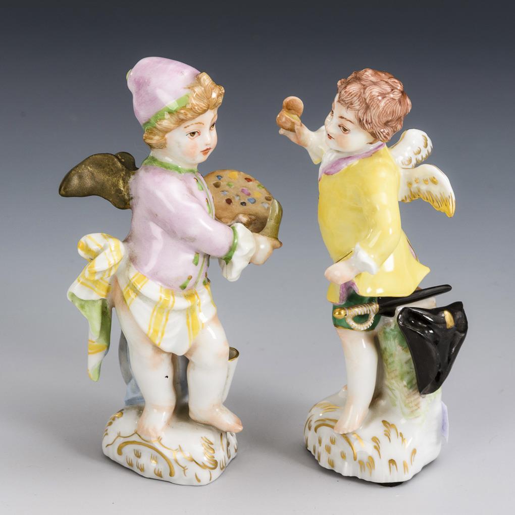 Putto mit Palette als Maler und Putto mit Tabatiere und Degen als Kavalier. 1x Flügel und Messer restauriert.