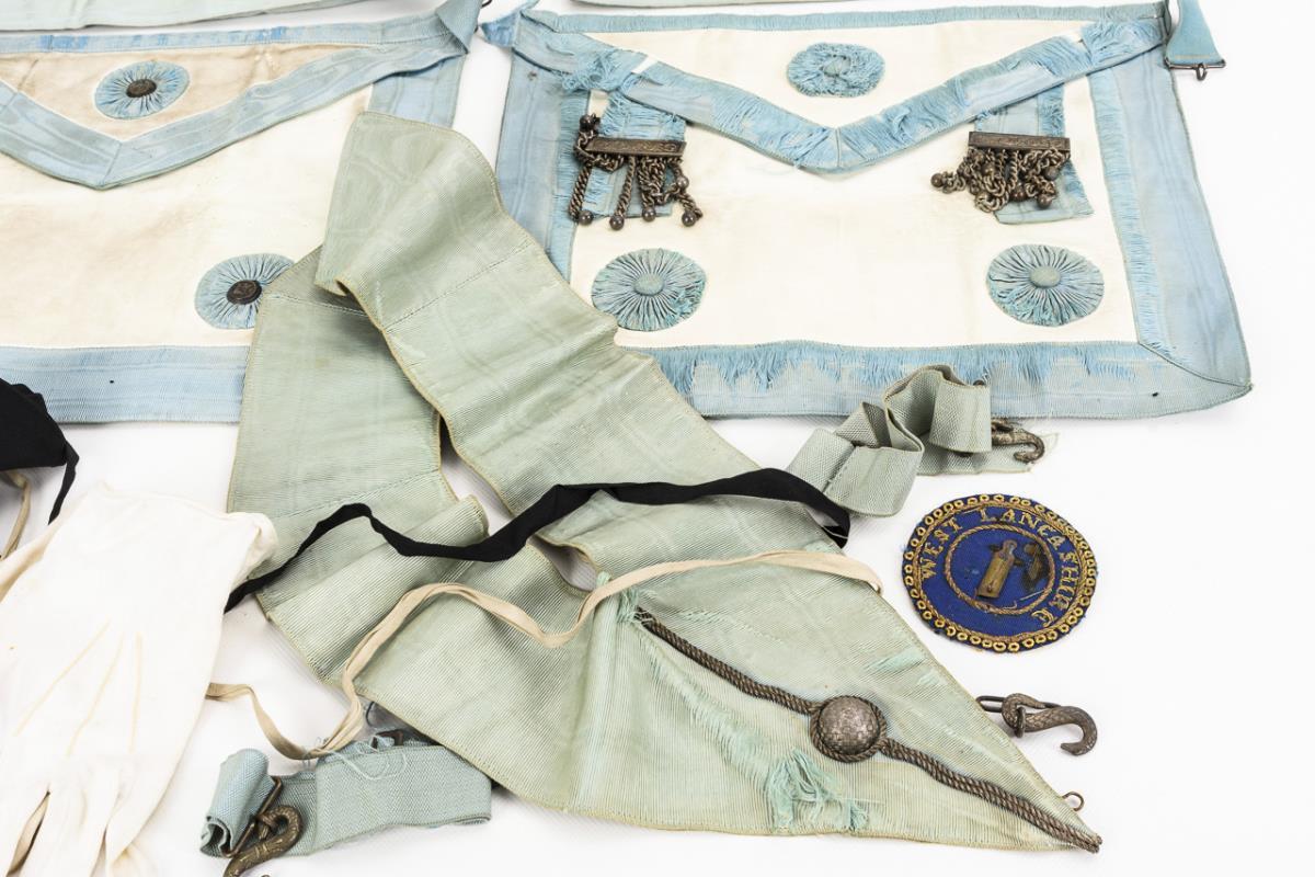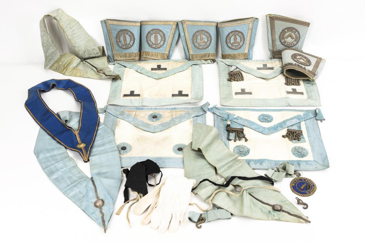 4 hellblaue Stulpen, 4 Beamtenbänder in Hellblau mit Silber und Dunkelblau mit Gold, 4 Schürzen teils mit Rosetten, Tasseln und Taus. 1 Paar weiße Stoffhandschuhe, 1 Beffchen, 2 hellblaue Bijou-Bänder mit Schlangenhaken, 1 Schlangenhaken, 1 Logenapplik ohne Nr., weiße Bänder. Alters-/Gebrauchsspuren.