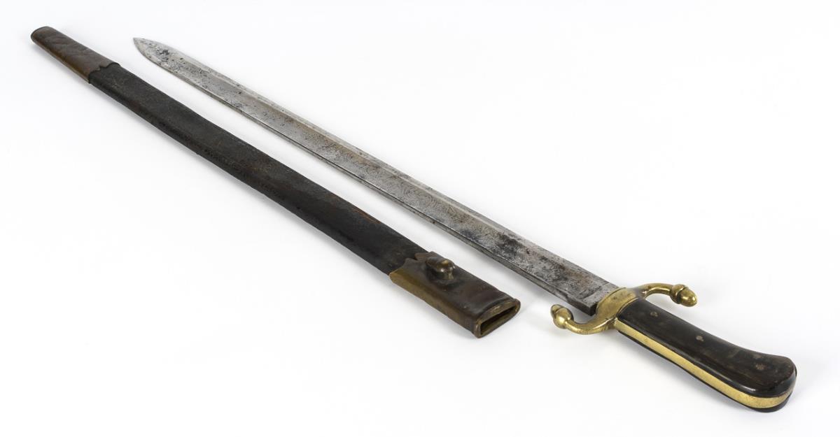 Gerade einschneidige Klinge mit beidseitiger Musterätzung auf dem breiten Hohlschliff der Klinge. Zweischaliger Horngriff, Messing-Parierstange mit Eichelenden. Lederscheide wohl jünger ergänzt. Klinge mit alten Korrossionsnarben.
