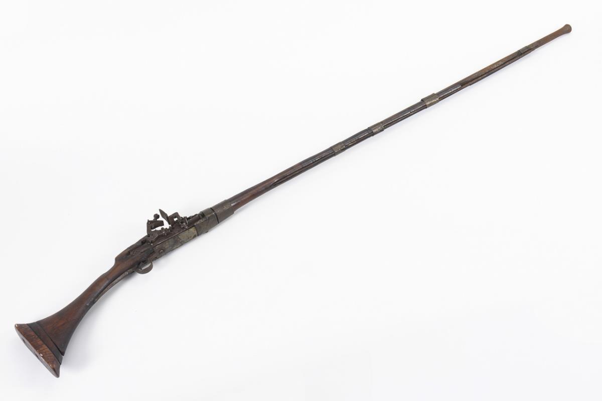 Muskete mit langem Lauf, Kolben aus dreierlei Holz. Schloß mit außen liegendem Mechanismus. Gegenplatte ergänzt und genagelt. Starke Alters- und Gebrauchsspuren.