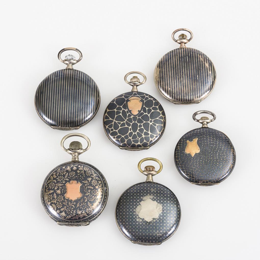 5 Niello-Sprungdeckelgehäuse, 1 Lépine-Gehäuse, verschiedene Dekore, teils mit leerer Wappenreserve. Zifferblätter mit arabischen Zahlen, Minutenkranz und kleiner Sekunde. Alters- und Gebrauchsspuren, Deckel der UH nicht richtig schließend, 1 ergänzte Krone.