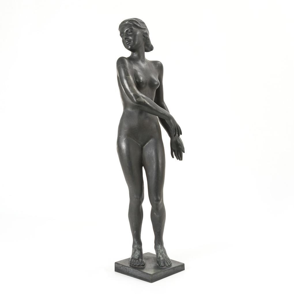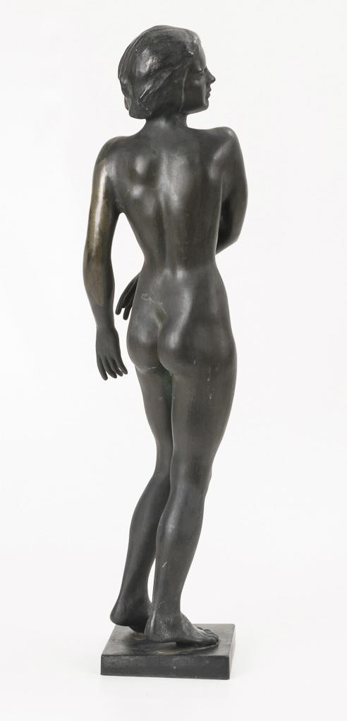 Schlanke junge Frau in anmutiger Geste. Patina teils stark berieben, kleine Ausbesserung auf der Schulter.