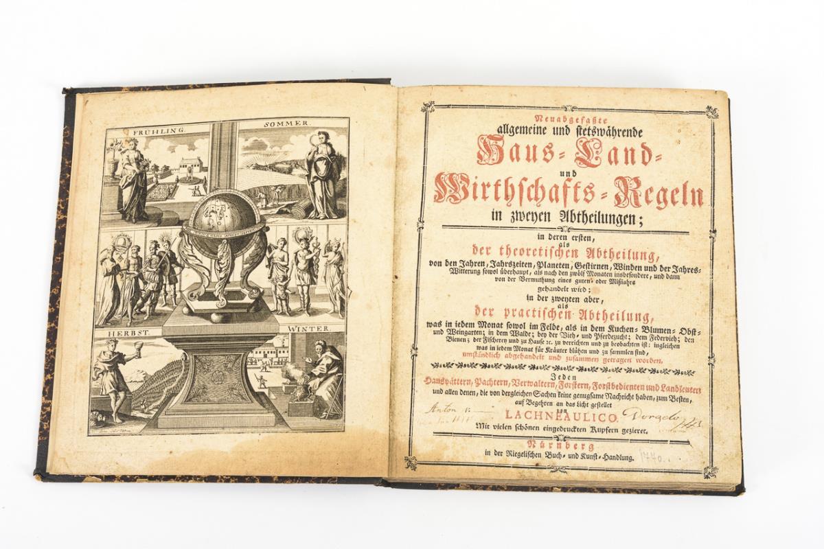 "... was in jedem Monat sowol im Felde, als in dem Kuchen- Blumen- Obst- und Weingarten; in dem Walde, bey der Vieh- und Pferdezucht, dem Federvieh, den Bienen; der Fischerei und zu Hause zu verrichten und zu beobachten ist; ingleichen was in jedem Monat für Kräuter blühen und zu sammeln sind". (8), 260 Seiten mit 20 meist halbseitigen Stichen und zahlreichen Tabellen. Jüngerer Halbleineneinband.