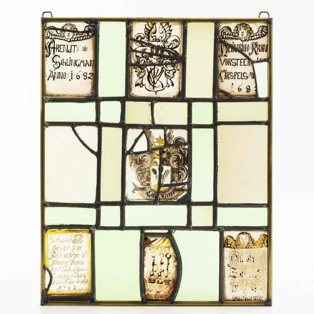 Klarglas und Farbglas, teils gebeizt und bemalt, teils beschriftet. Bleiruten, Messingleiste. Scheiben maximal 13 x 11 cm, gesamt 50 x 40 cm.
