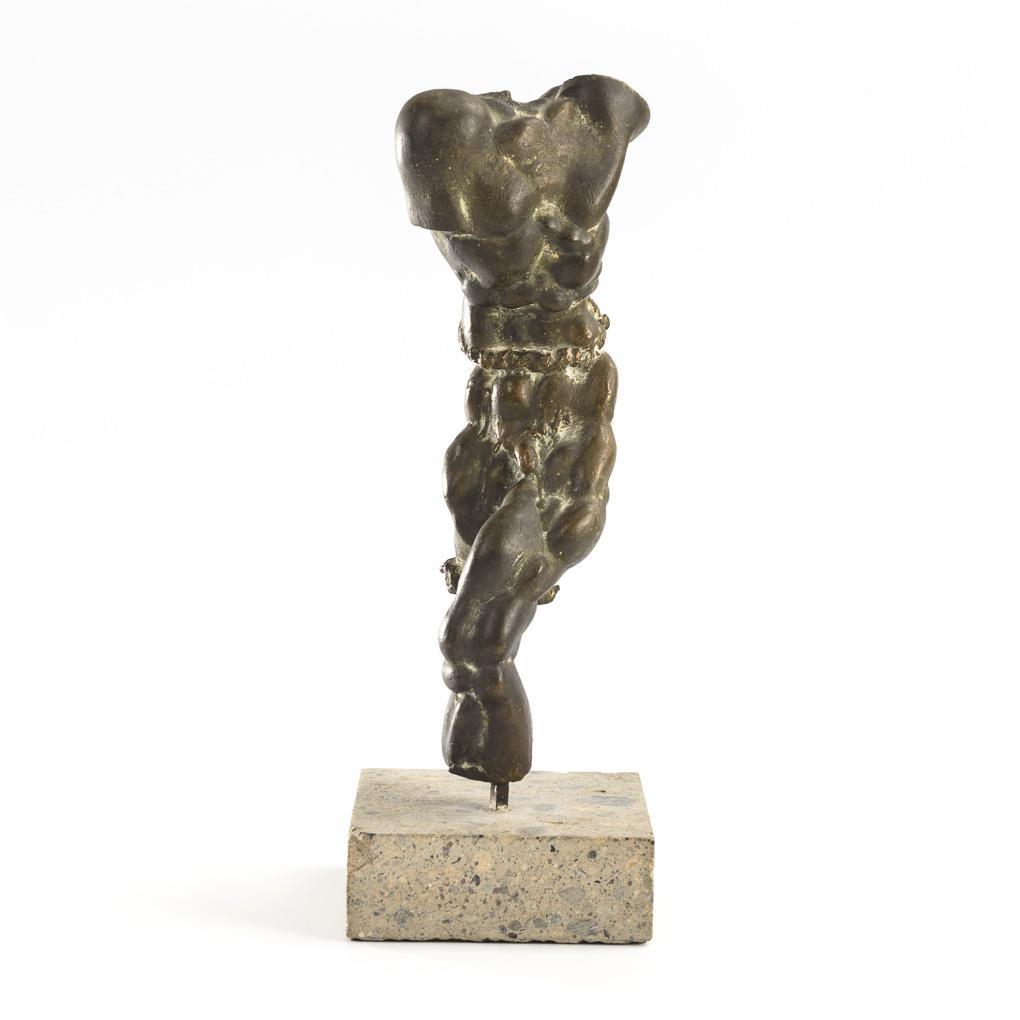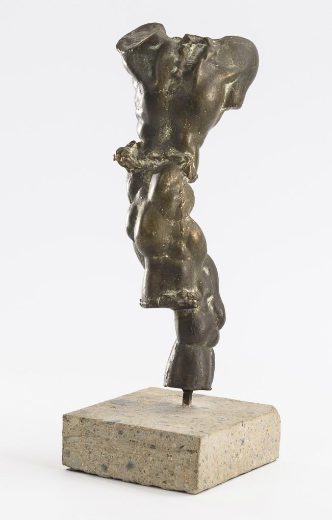 Tordierte und gelängte Figur eines Mannes mit ausgeprägter Muskulatur. Kleiner Abplatzer am Sockel.