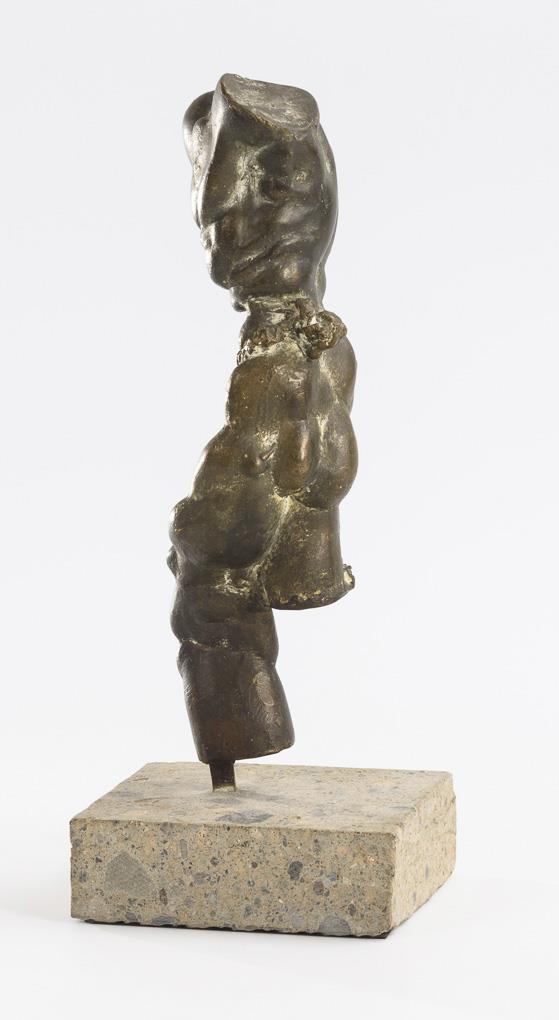 Bronze patiniert mit Resten der weißen Gussform, Beton-Sockel. 1980er Jahre(?). H 31 / 37 cm.