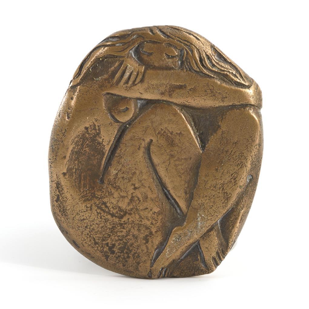 Ähnlich einer Plakette beidseitig im Basrelief ausgeführter Akt einer sitzenden Frau.