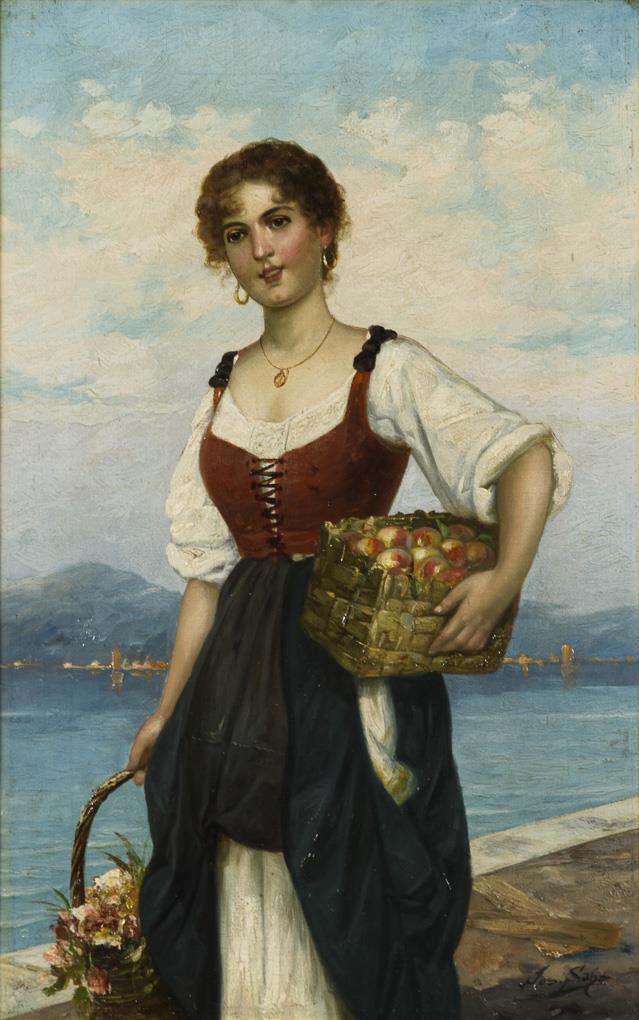 Bildnis einer jungen Frau mit Blumenkorb und Früchten an einem See.