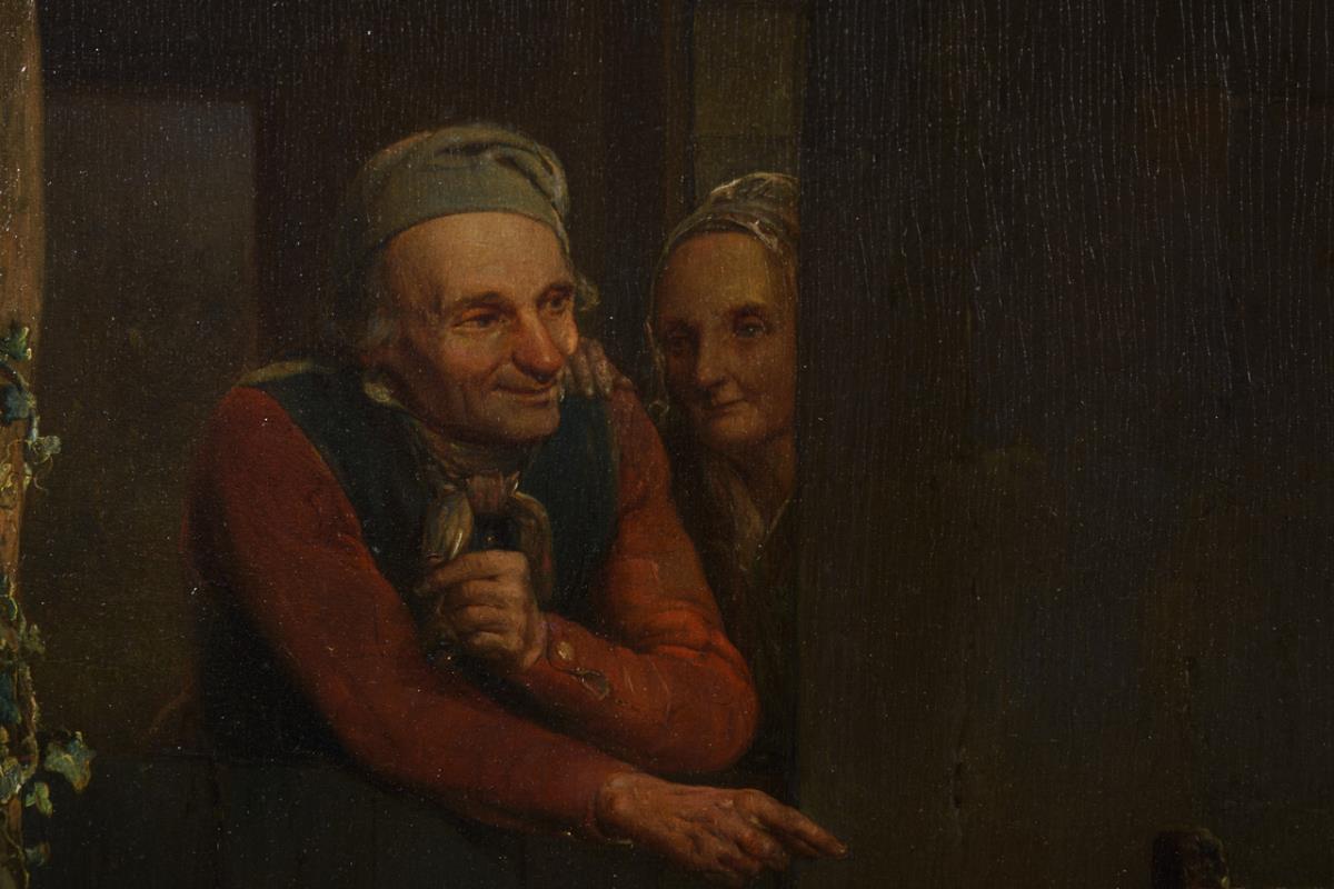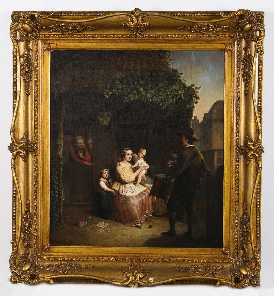 Genreszene mit Spielmann im Hof einer Familie mit kleinen Kindern. Leichte Altersspuren.
