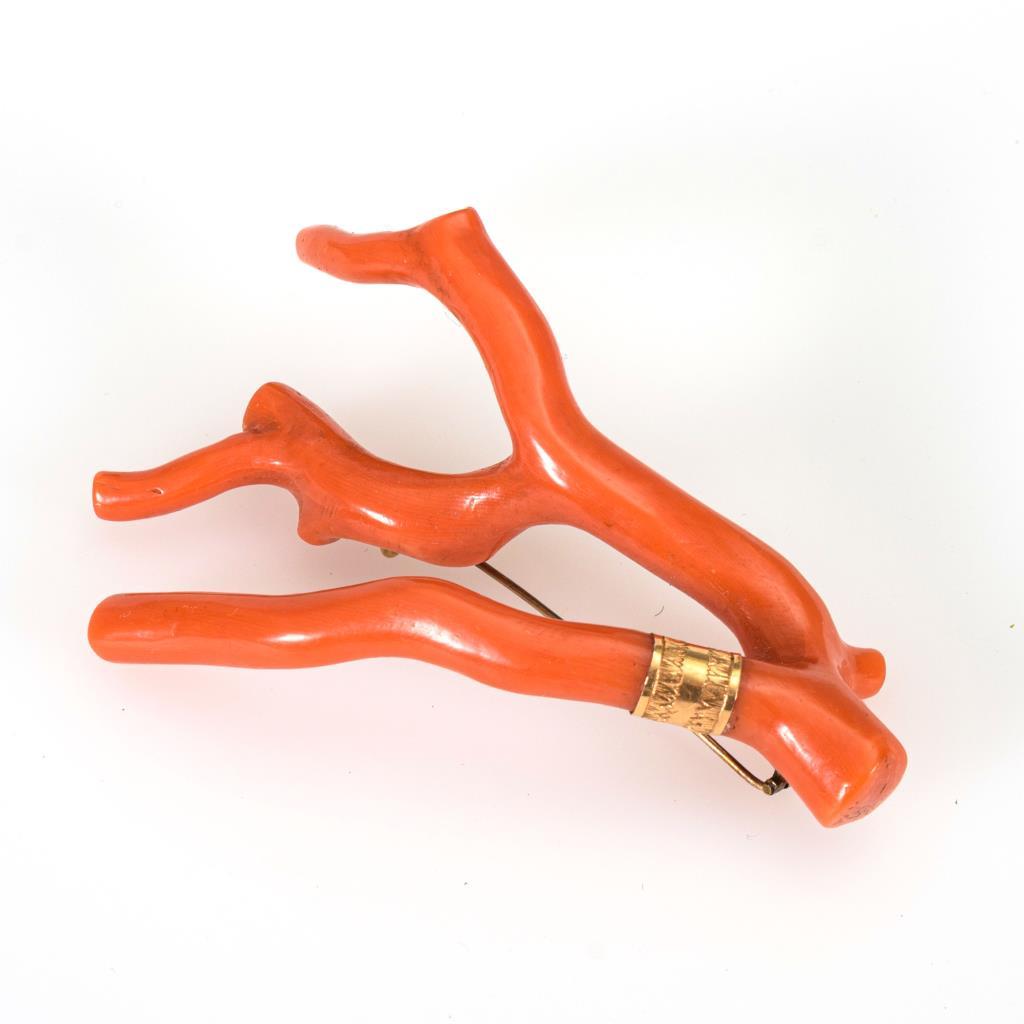 Lachsfarbener Korallenast mit Hakenverschluss. 1 Bruchstelle mit gravierter Manschette verziert .