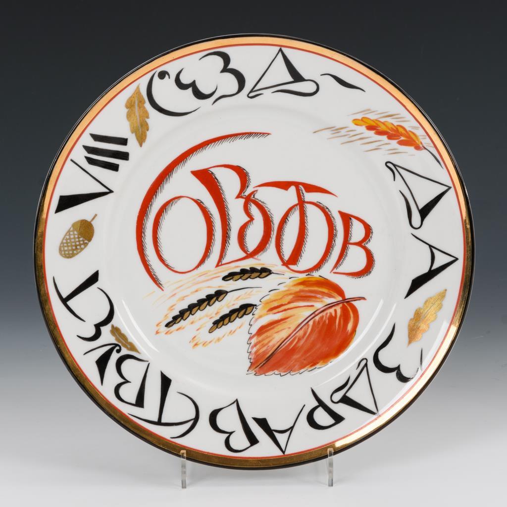 Flacher Teller mit kyrillischer Parole sowie Ähren und Blättern.