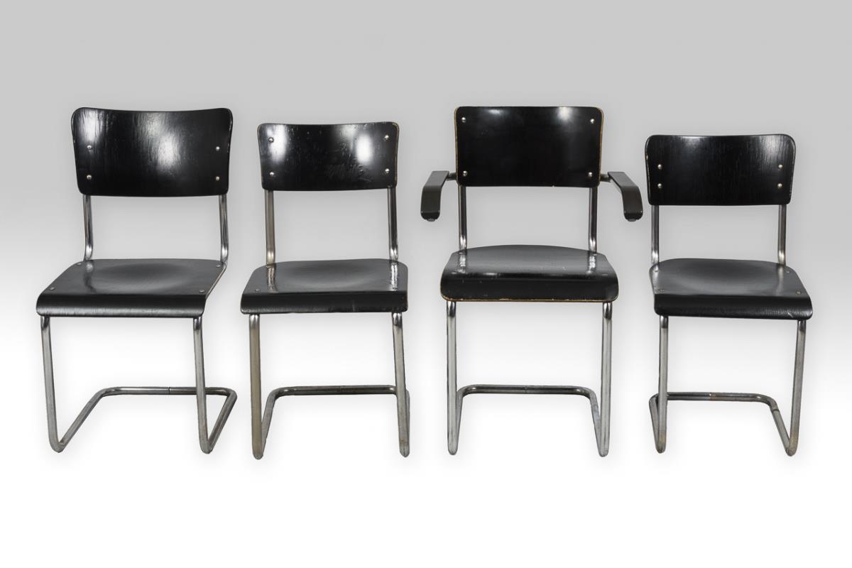 4 "hinterbeinlose Kragstühle" und Bauhaus-Design-Klassiker: 3 Freischwinger "S 32", H 75 bis 80 cm, Sitzhöhe ca. 43 bis 44 cm | 1 Armlehn-Freischwinger "S 64", H 82 cm, Sitzhöhe ca. 46 cm. Je Alters-/Gebrauchsspuren, je etwas rostig, teils überfasst.