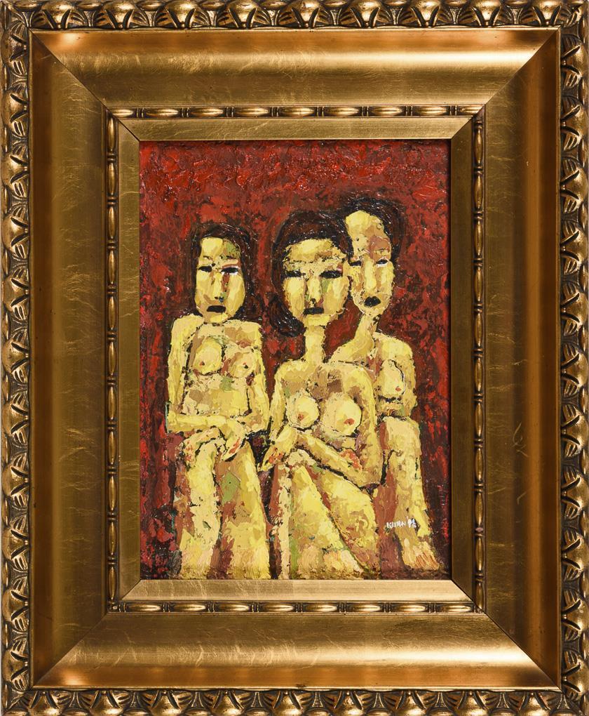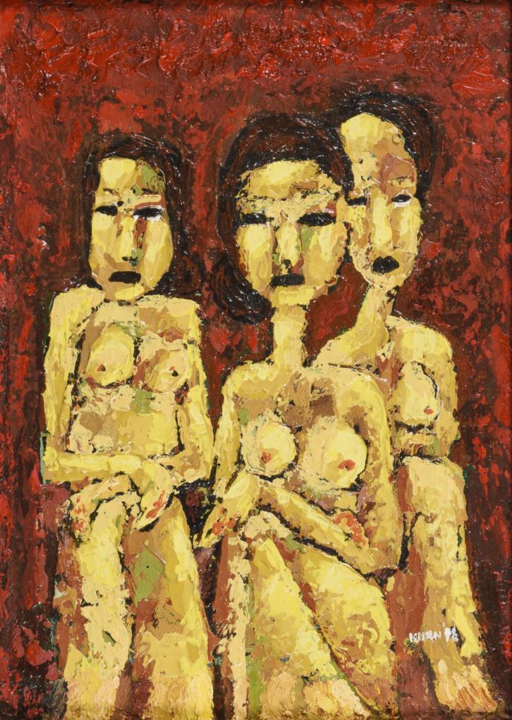 Abstraktes Gemälde mit drei Frauenakten vor rotem Hintergrund.