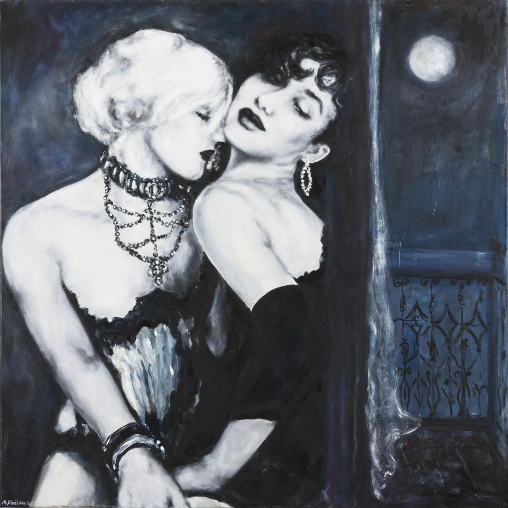 In sinnlicher Umarmung befindliches Liebespaar bei Vollmond an einem geöffneten Balkonfenster.