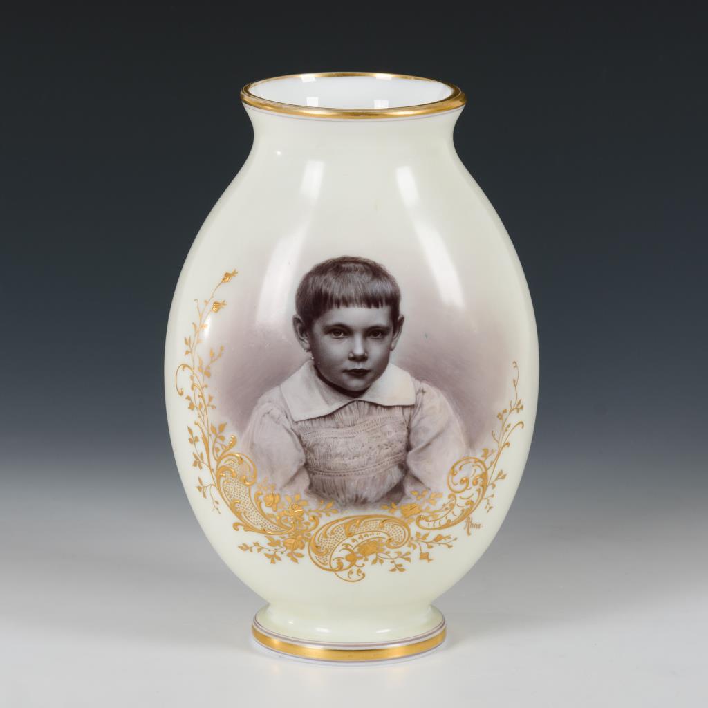 Balustervase mit dem schauseitigen Porträt eines Knaben, wohl dem Enkel Kaiser Wilhelms II., Karl Wilhelm Prinz von Preußen. Minimaler Goldabrieb.