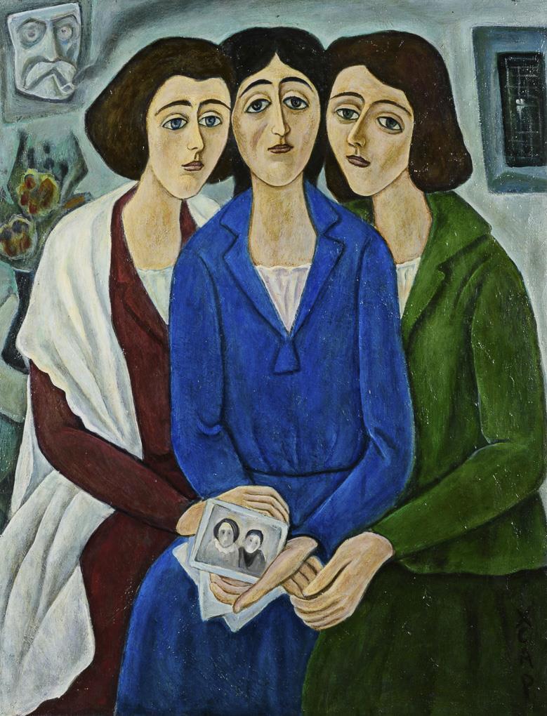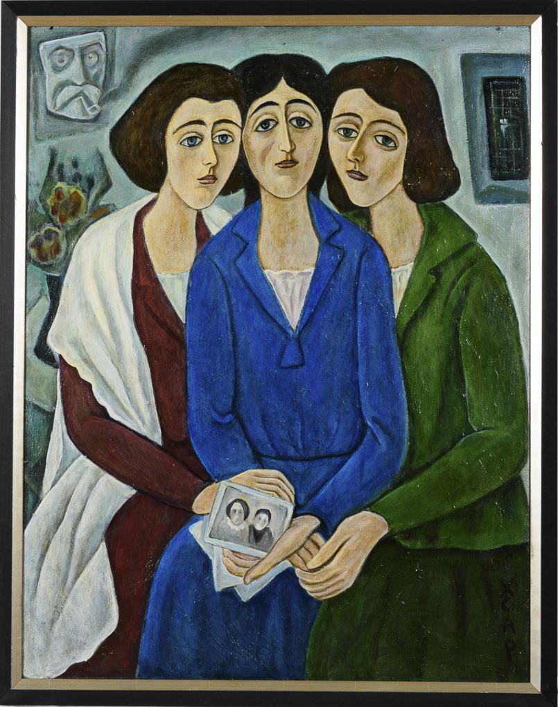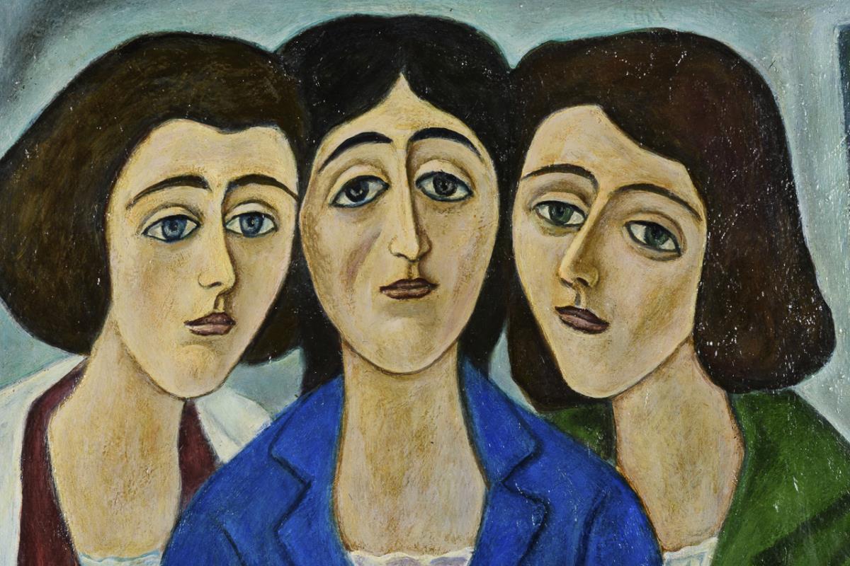 Bildnis der drei Frauen in verschieden farbigen Kleidern.